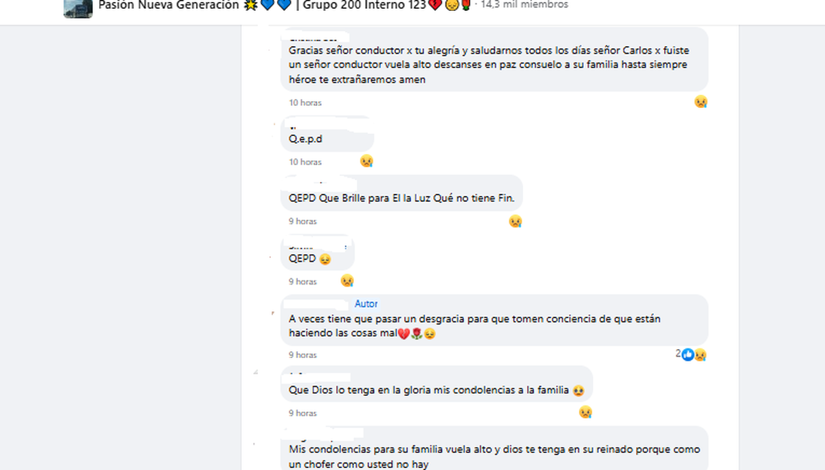 Mientras se analizan las circunstancias en las que el colectivo habría perdido el control, a priori por una falla en los frenos, a última hora de la jornada los amigos y colegas manifestaron indignación y mucha tristeza en un posteo que realizaron en la página de Facebook Pasión Nueva Generación.