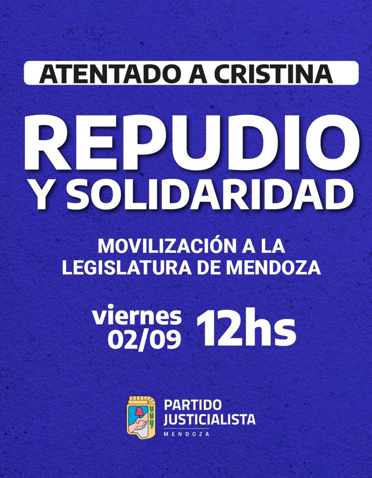 El peronismo convocó a una movilización para este viernes al mediodía en respaldo a Cristina Fernández de Kirchner. El espacio llamó a marchar por las calles del centro hasta reunirse en la Legislatura de Mendoza, donde se espera que confluyan tanto referentes justicialistas como militantes y sindicatos. El eje central será el repudio al atentado que sufrió la vicepresidenta frente a su domicilio.