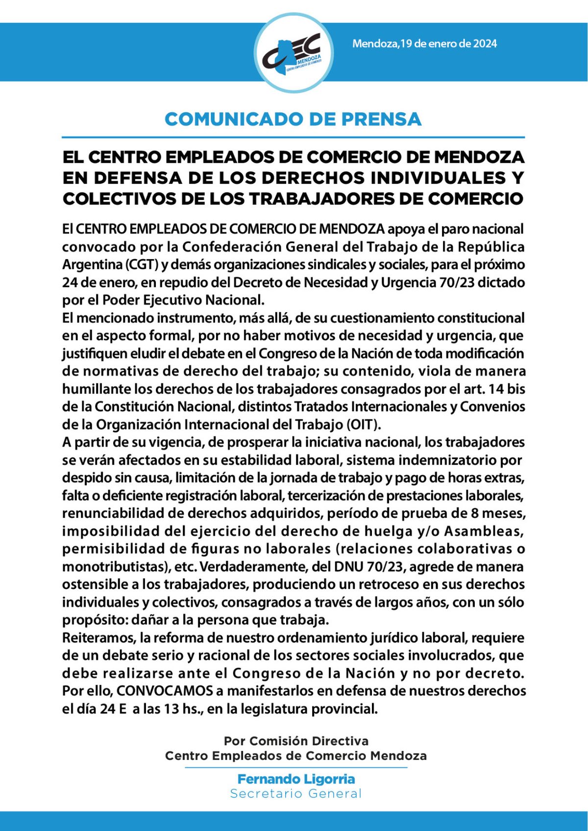 El titular del CEC, Fernando Ligorria, expresó este viernes su respaldo a la protesta contra el Decreto de Necesidad y Urgencia (DNU) y la Ley Ómnibus, actualmente en tratamiento en el Congreso de la Nación.