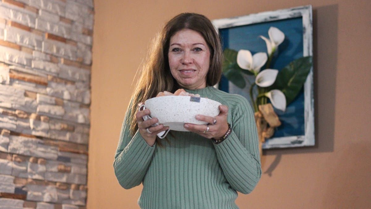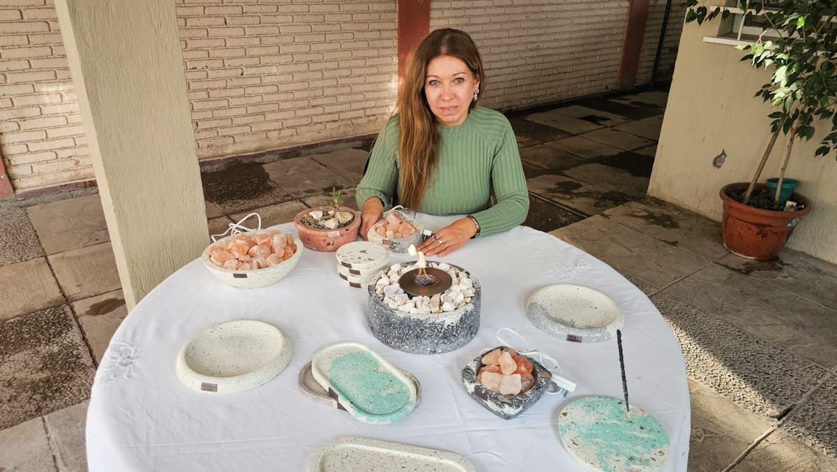 Laura Bonasera (53) es dueña de Piedras del desierto, un emprendimiento que fabrica lámparas, fogonegos, bandejas y platos con la milenaria técnica terrazo. Es un un proceso 100% artesanal que se realiza con piedras naturales y cemento.