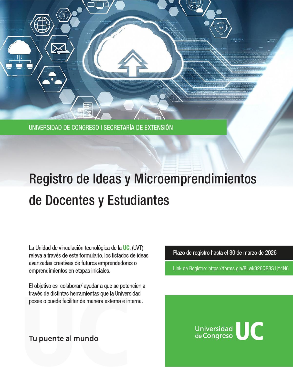 La Universidad de Congreso, a través de su Unidad de Vinculación Tecnológica (UVT), presenta el Registro de Ideas y Microemprendimientos de Docentes y Estudiantes UC, una convocatoria orientada a relevar, acompañar y potenciar proyectos innovadores surgidos en el ámbito académico.