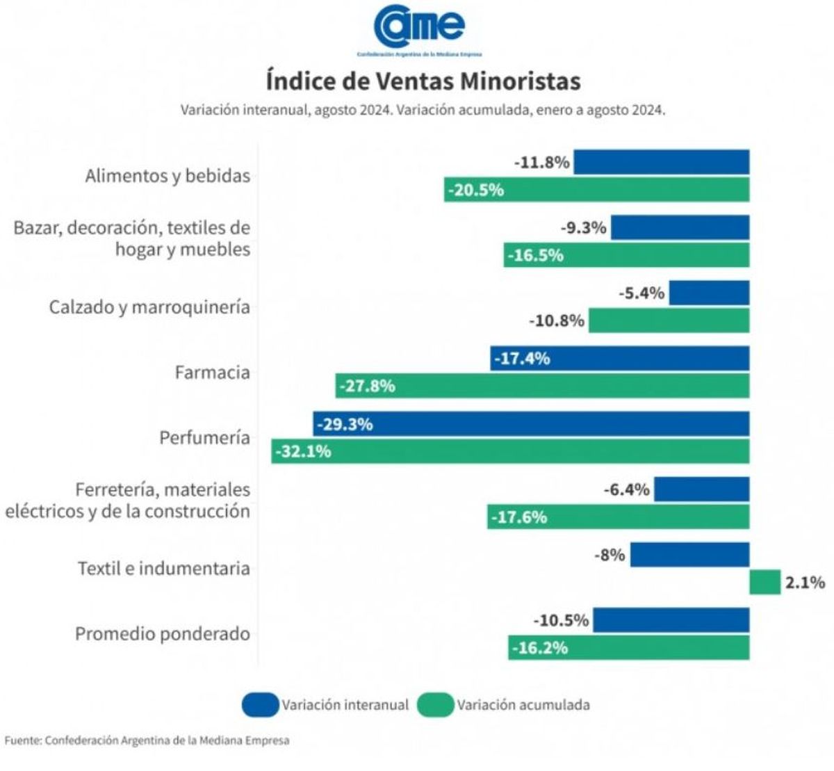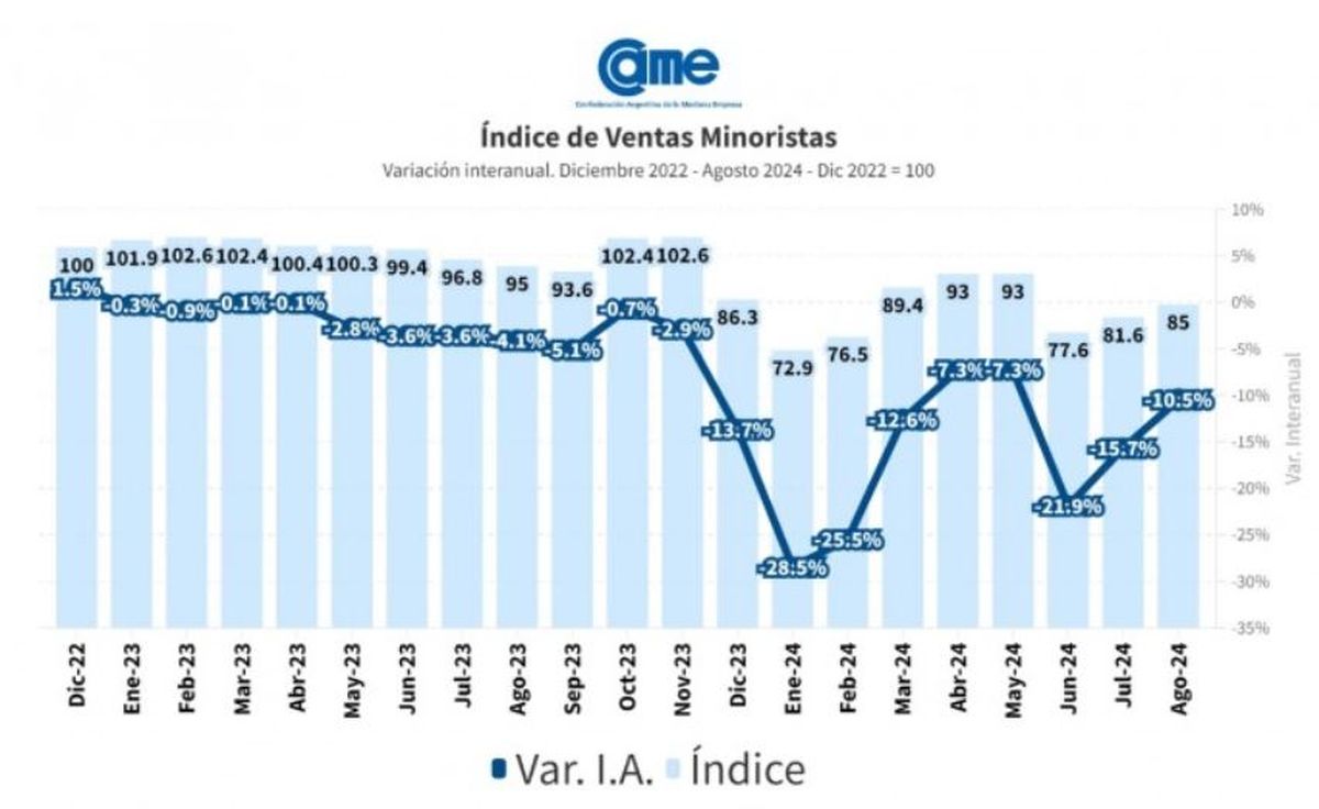 Las ventas minoristas pymes bajaron un 10,5 por ciento interanual en agosto, a precios constantes, y acumulan un descenso de 16,2 por ciento en los primeros ocho meses del año, según un relevamiento de la Confederación Argentina de la Mediana Empresa (CAME).