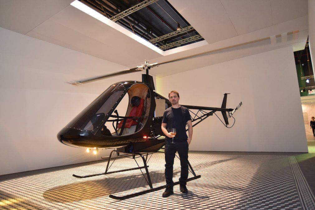Una vez dentro, el interior estaba en penumbras, solamente iluminado por la luz que llegaba del exterior. El centro del espacio estuvo ocupado por un helicóptero encendido, con sus palas girando a baja velocidad. Se trata de un prototipo de un helicóptero artesanal, con espacio para una sola persona, que esta posado sobre un piso tipo damero, similares a los utilizados en los patios de las antiguas casas porteñas.
