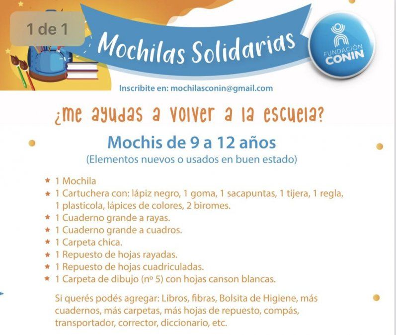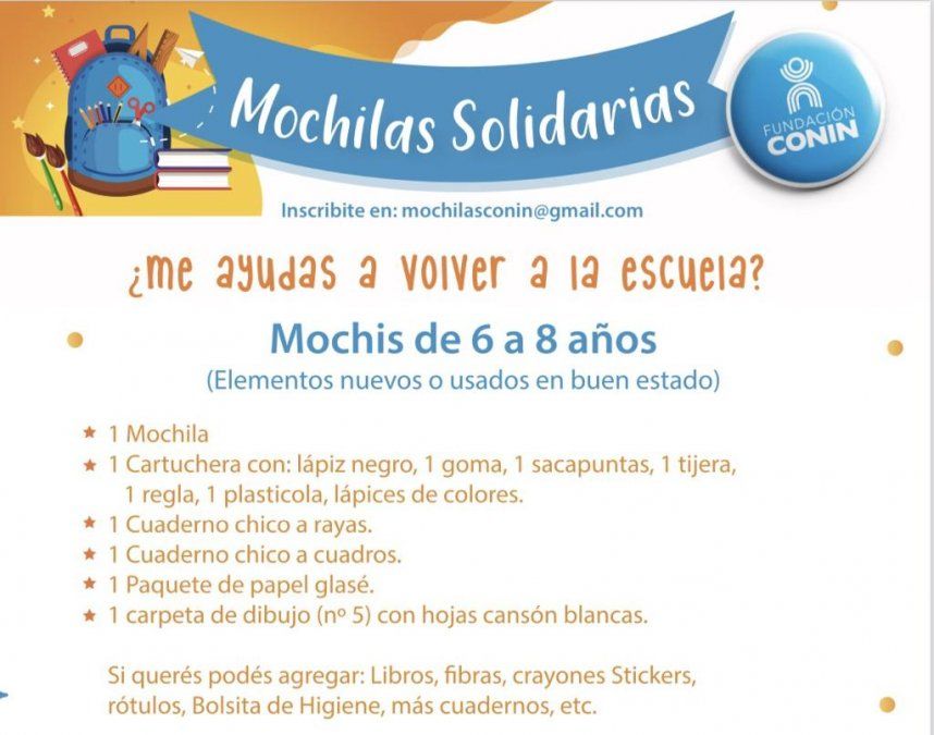 Fundación CONIN está organizando una nueva edición de su campaña “Mochilas solidarias”. Se puede ayudar donando mochilas con útiles escolares o una suma de dinero equivalente a los materiales necesarios. Lo recaudado será entregado a niños de las familias que asisten a los centros ubicados en Las Heras, Mendoza.