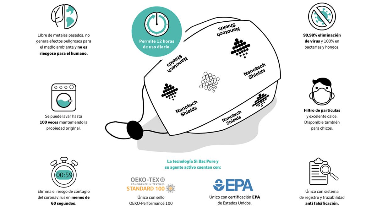 Estas mascarillas a diferencia de lo que se ofrece en el mercado, no solo eliminan el 99,98% de Coronavirus en todas sus cepas, el 100% de bacterias y hongos, se pueden lavar 100 veces de acuerdo a los ensayos y normativas ISO 18184.
