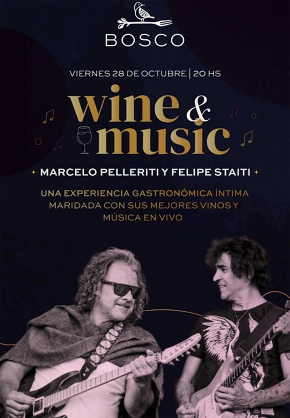 Marcelo Pelleriti y Felipe Staiti brindarán una noche de música en vivo maridada con los mejores vinos