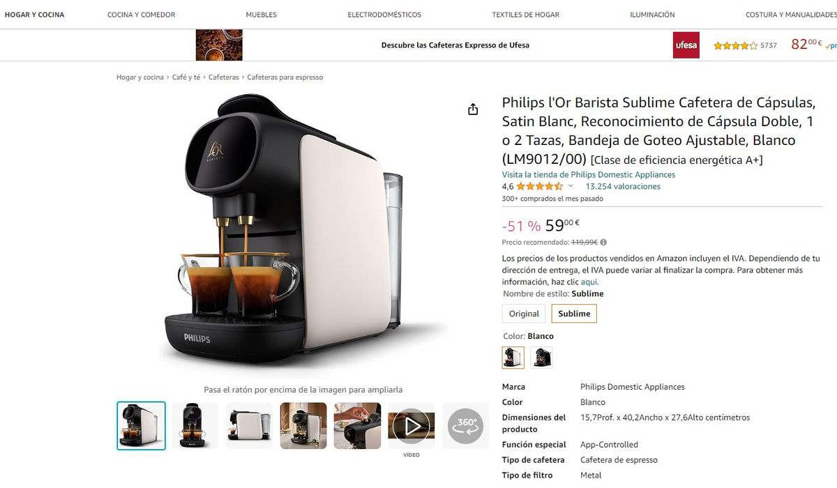 La cafetera Philips prepara dos cafés a la vez u opta por un café doble en una sola taza. La máquina en descuento ofrece hasta 19 bares de presión para garantizar un espresso perfecto. Además, cuenta con un menú completo de cafés que incluye cortado, espresso, largo y más. Con este electrodomésticos que consigues en Amazon puedes personalizar el volumen de tu café desde 20 ml hasta 270 ml según tus preferencias. Además, es compatible con cápsulas L'OR Espresso, L'OR Barista y Nespresso.