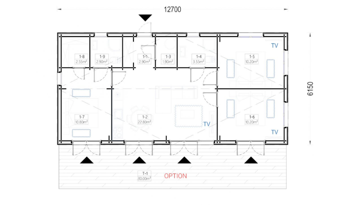 - Una espaciosa terraza de 30 m² (opcional) donde podrá colocar algunas tumbonas y muebles de exterior para así relajarse y descansar tras un largo día.