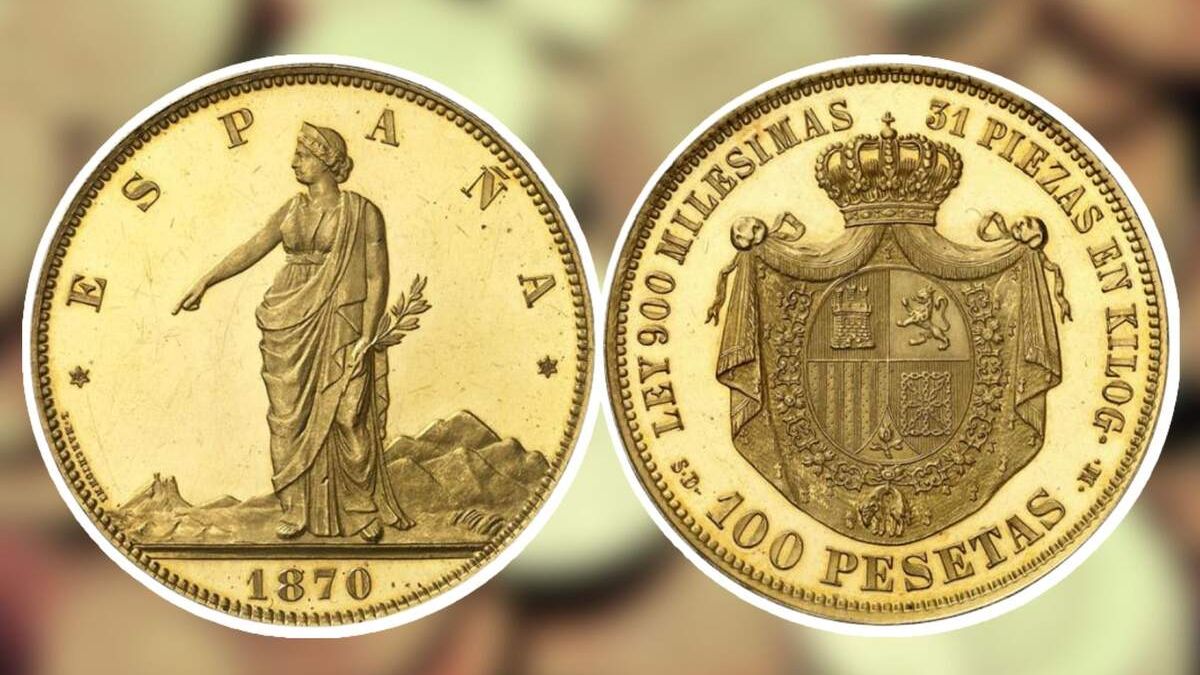 Esta pieza de coleccionista es de oro y data del año 1870, durante el gobierno provisional que hubo en España tras la caída del reinado de Isabel II, cuyo diseño es poco habitual al de otras pesetas de la misma época, llamando así la atención.