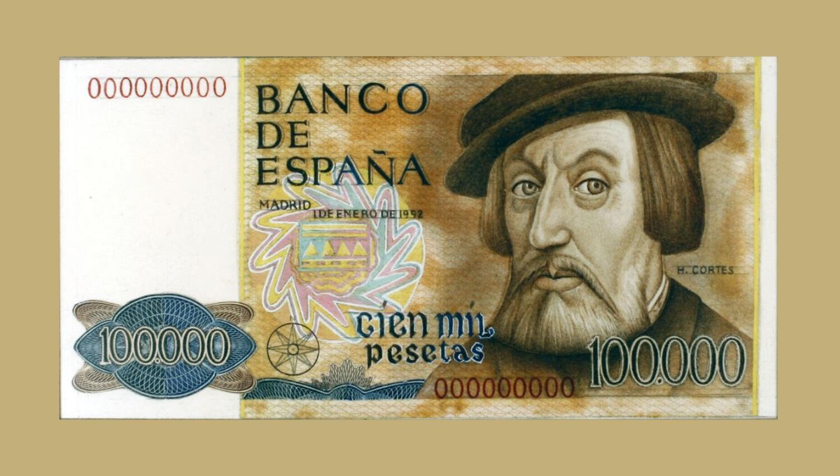 Uno de los ejemplares más fascinantes y codiciados por los coleccionistas es el billete de 100.000 pesetas emitido el 1 de enero de 1992, con la figura de Hernán Cortés. Este billete, que pertenece a un conjunto de pruebas no adoptadas, se considera parte del "Proyecto Descubrimiento". Con la numeración 000000000, su singularidad y rareza lo convierten en un objeto de deseo para muchos.