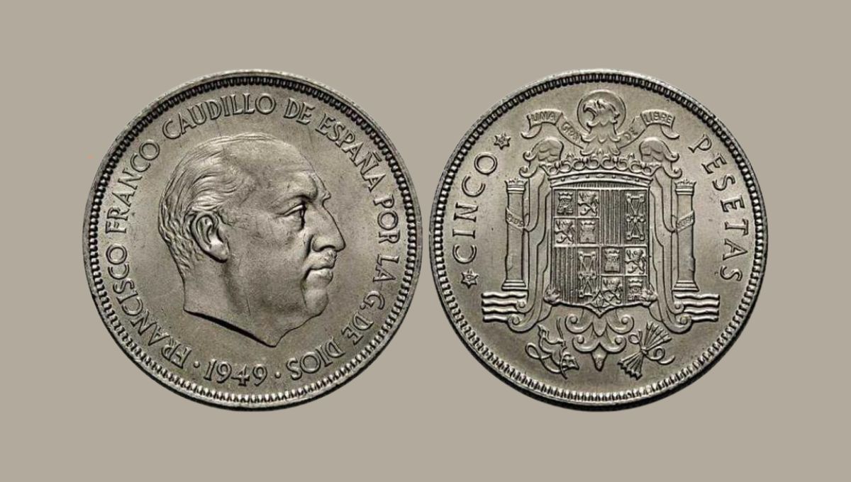 Una de las monedas más valiosas de la historia reciente de España es la moneda de cinco pesetas de 1949, especialmente aquellas acuñadas durante la dictadura de Francisco Franco.