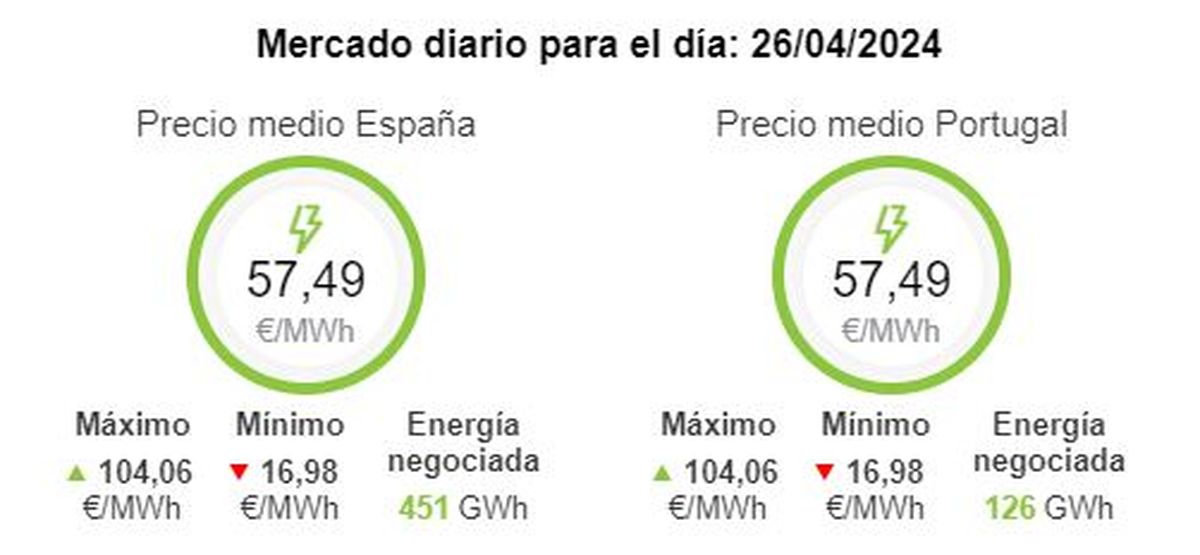 - De 21:00 a 22:00: 96.06 euros por MWh