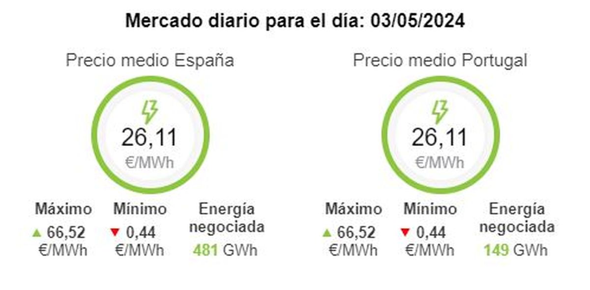 El Operador del Mercado Ibérico de Energía (OMIE), el precio más alto de la luz este viernes será de 66,52 euros. Mientras que el precio más bajo de la electricidad para el mismo día será de 0,44 euros.