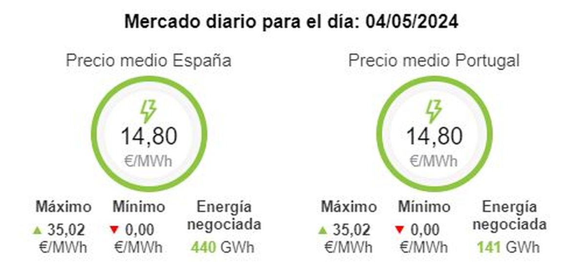 - De 14:00 a 15:00: 0,00 euros por MWh