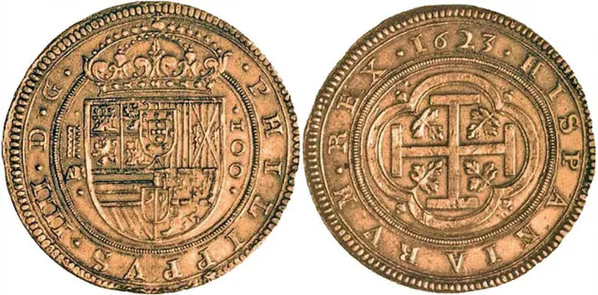 Esta moneda española está hecha de oro y su valor es de 100 escudos, lo que significa que se trata de una moneda muy antigua. En total, pesa 339 gramos y fue acuñada en el siglo XVII, durante los reinados de Felipe III y Felipe IV.