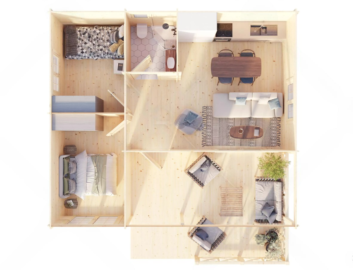 Construida de madera y con un diseño tradicional, esta casa prefabricada es perfecta para alojar a una familia de hasta tres integrantes. Cuenta con ciertas características y espacios que la hacen una vivienda funcional y confortable, como: