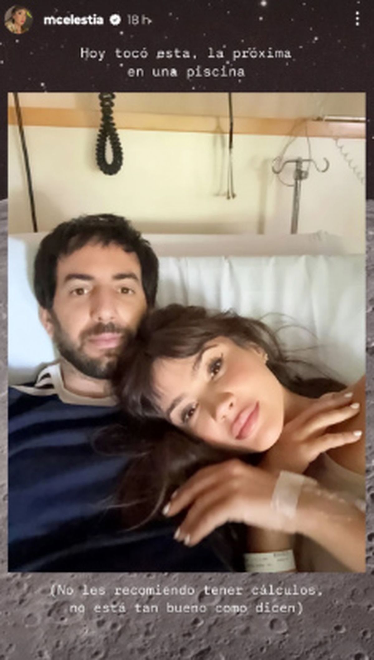 La bella y sensual actriz Celeste Cid fue internada este fin de semana en la Clínica Olivos de Buenos Aires por un fuerte malestar. La artista debió moverse en silla de ruedas para que le hicieran los chequeos médicos por el agudo dolor con el que ingresó. En sus redes sociales aclaró que se trata de cálculos renales, información que dio coincidentemente su novio: el actor Santiago Korovsky (División Palermo).