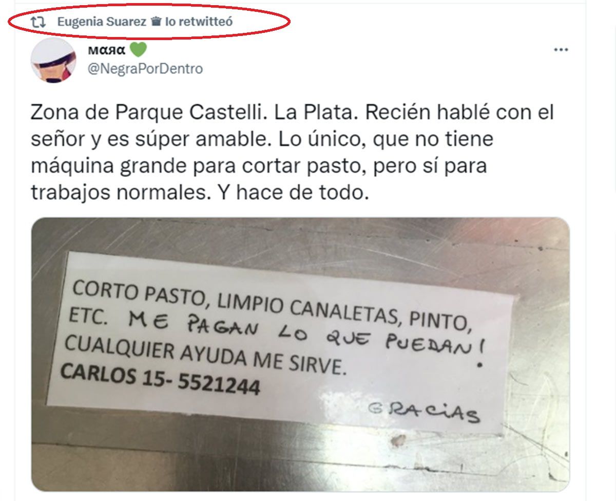 La China Suárez replicó un tuit de la usuaria @negrapordentro que dice: "Zona de Parque Castelli, La Plata. Recién hablé con el señor y es súper amable. Lo único, no tiene máquina grande para cortar el pasto pero sí para trabajos normales. Y hace de todo".