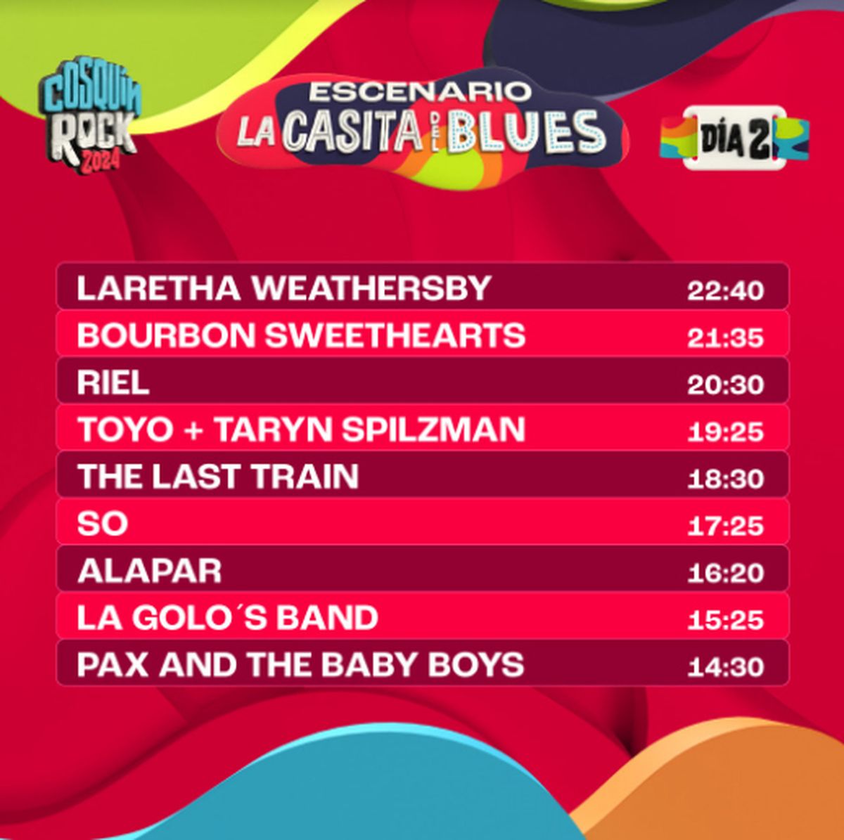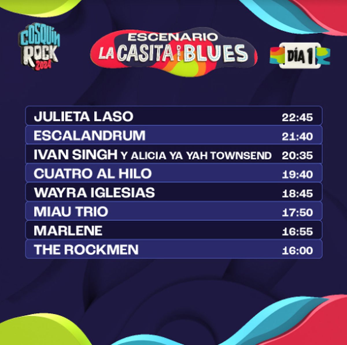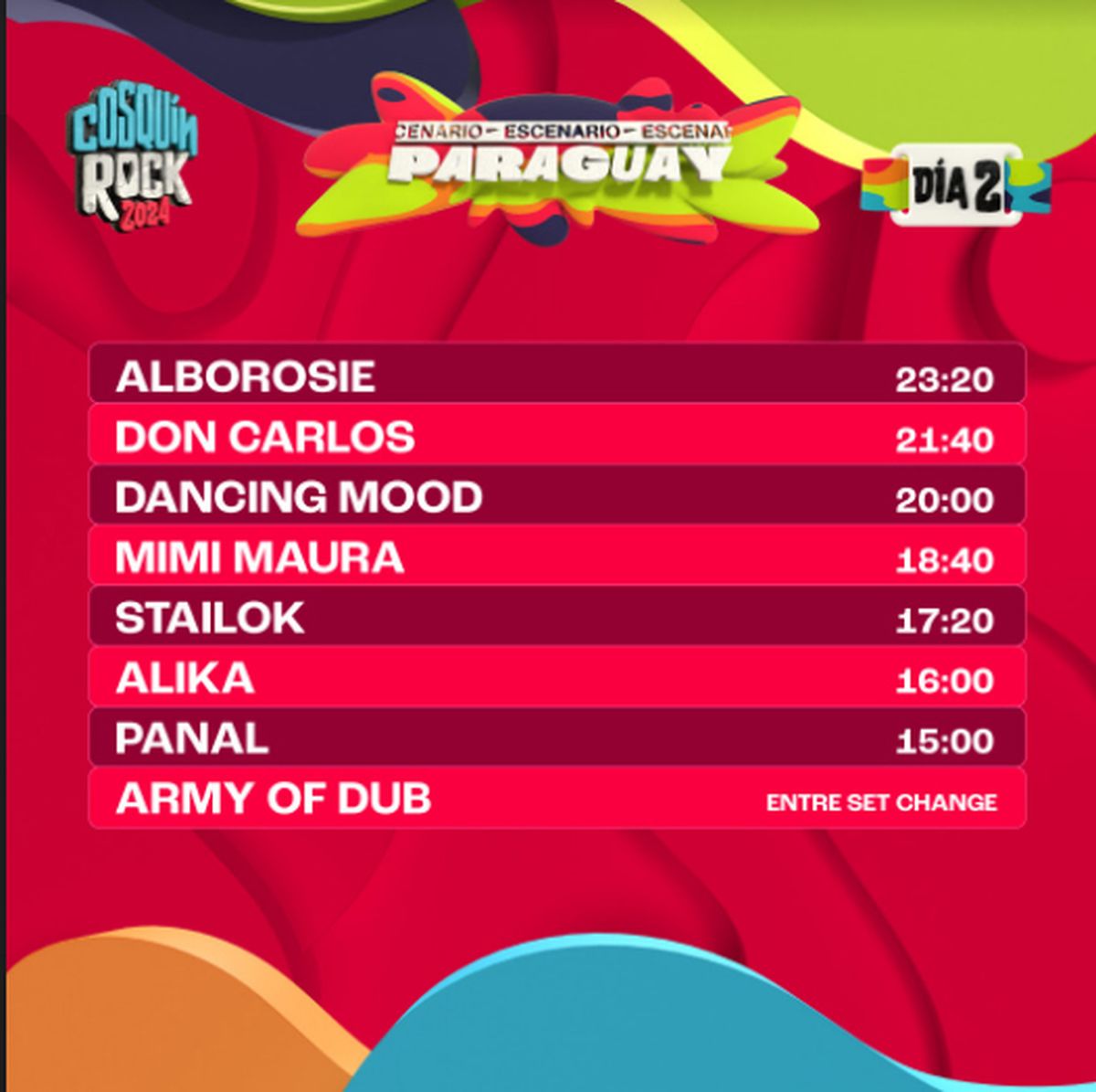 A pocos días del esperado evento, se ha anunciado el horario exacto de cada presentación, lo que permitirá a los asistentes planificar sus jornadas. Un dato no menor es que esta edición contará con 6 escenarios diferentes: el Escenario Norte, el Escenario Sur, el Escenario Montaña, el Escenario Paraguay, el Escenario Boomerang y el Escenario La Casita del Blues.
