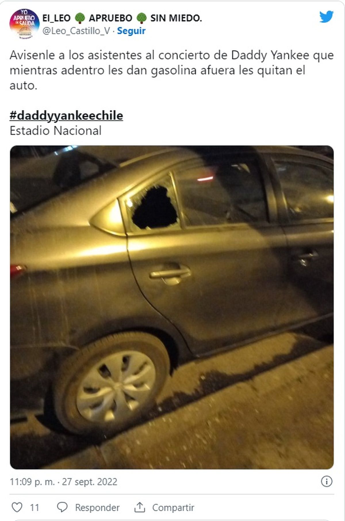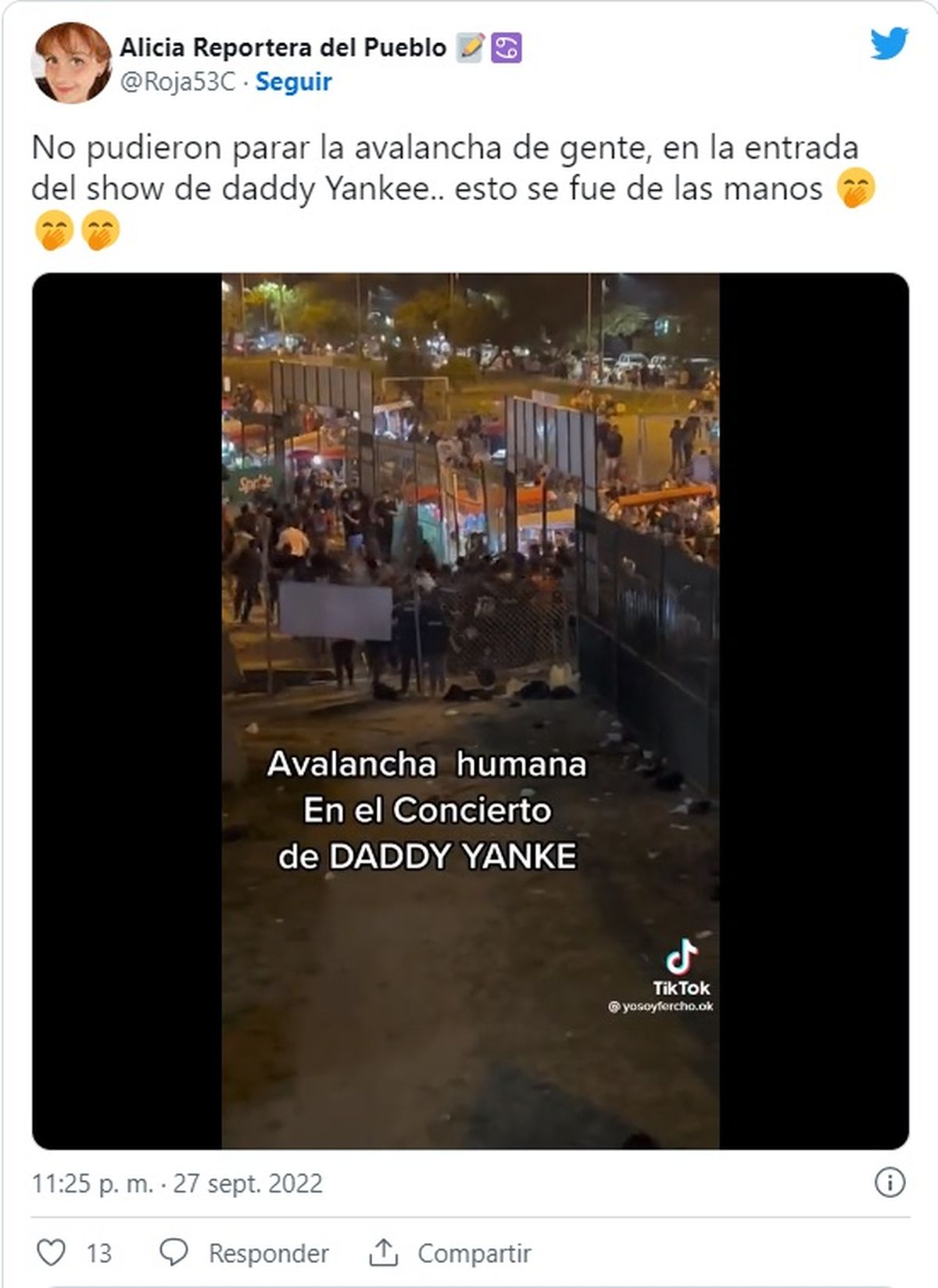 Una mujer que se hace llamar Alicia Reportera del Pueblo publicó el derribo de vallas, mientras que @Leo_Castillo_V ironizó con los destrozos en el exterior del estadio: "Avisenle a los asistentes al concierto de Daddy Yankee que mientras adentro les dan gasolina afuera les quitan el auto".