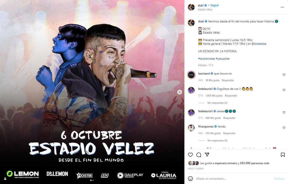 Con su show en Vélez, y con tan solo 25 años, Mauro Ezequiel Lombardo Quiroga -tal el nombre “de civil” de Duki- no solo demuestra su poder de convocatoria sino que vuelve a marcar un momento bisagra para la cultura al llevar sus canciones a una fecha en solitario en un estadio.