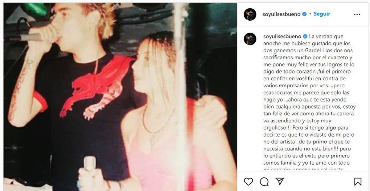 "La verdad que anoche me hubiese gustado que los dos ganemos un Gardel ! los dos nos sacrificamos mucho por el cuarteto y me pone muy feliz ver tus logros te lo digo de todo corazón", empieza el posteo de Ulises en una foto retro con su prima Magui Olave, también cuartetera y que estuvo ternada por su disco Mi camino.