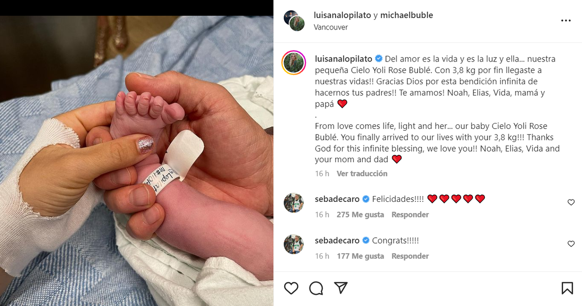 "Del amor es la vida y es la luz y ella... nuestra pequeña Cielo Yoli Rose Bublé. ¡¡Con 3,8 kg por fin llegaste a nuestras vidas!! ¡¡Gracias Dios por esta bendición infinita de hacernos tus padres!! ¡Te amamos!", escribieron ambos integrantes de la pareja en redes sociales, tanto en castellano como inglés.