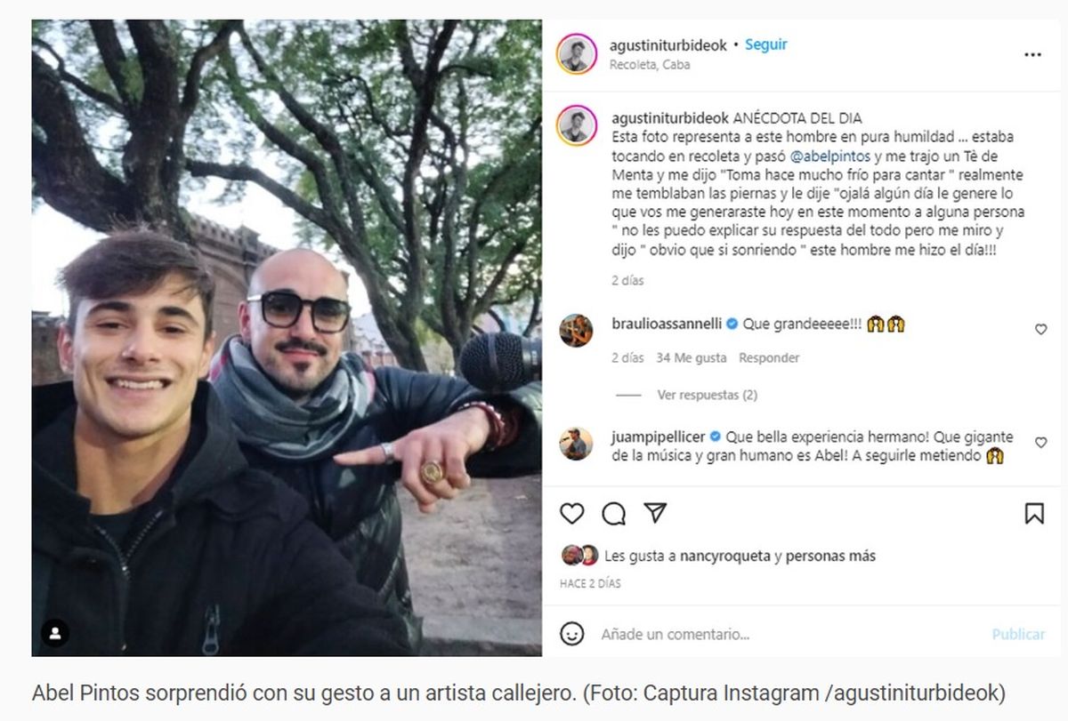 Agustín Iturbide es músico y se encontraba tocando en el barrio porteño de Recoleta, cuando en un momento pasó el reconocido cantante Abel Pintos y tuvo un gran gesto solidario con él: le acercó una taza de té para combatir el intenso frío del invierno.