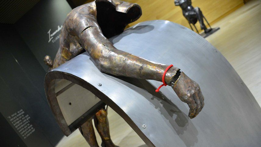“Esta muestra es una síntesis del que mata y del que muere, del victimario y la víctima”, afirmó Natasha. “Del que mata sin piedad apuntando con su revólver a otra persona y al que muere arrodillado como consecuencia de esa agresión. Es una síntesis perfecta de aquel que apunta con su arma y de aquel que cae por ese disparo, quebrado, su vida se quiebra, como el vidrio fragmentado”.