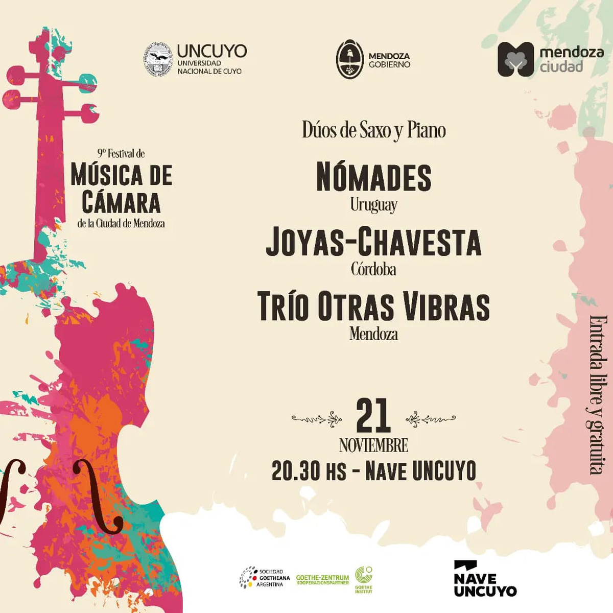 - Lunes. Dúos de saxo y piano Nómade (Uruguay) y Joyas - Chavesta (Córdoba), Trío Otras Vibras (Mendoza). Nave UNCUYP, sala roja. 20.30.