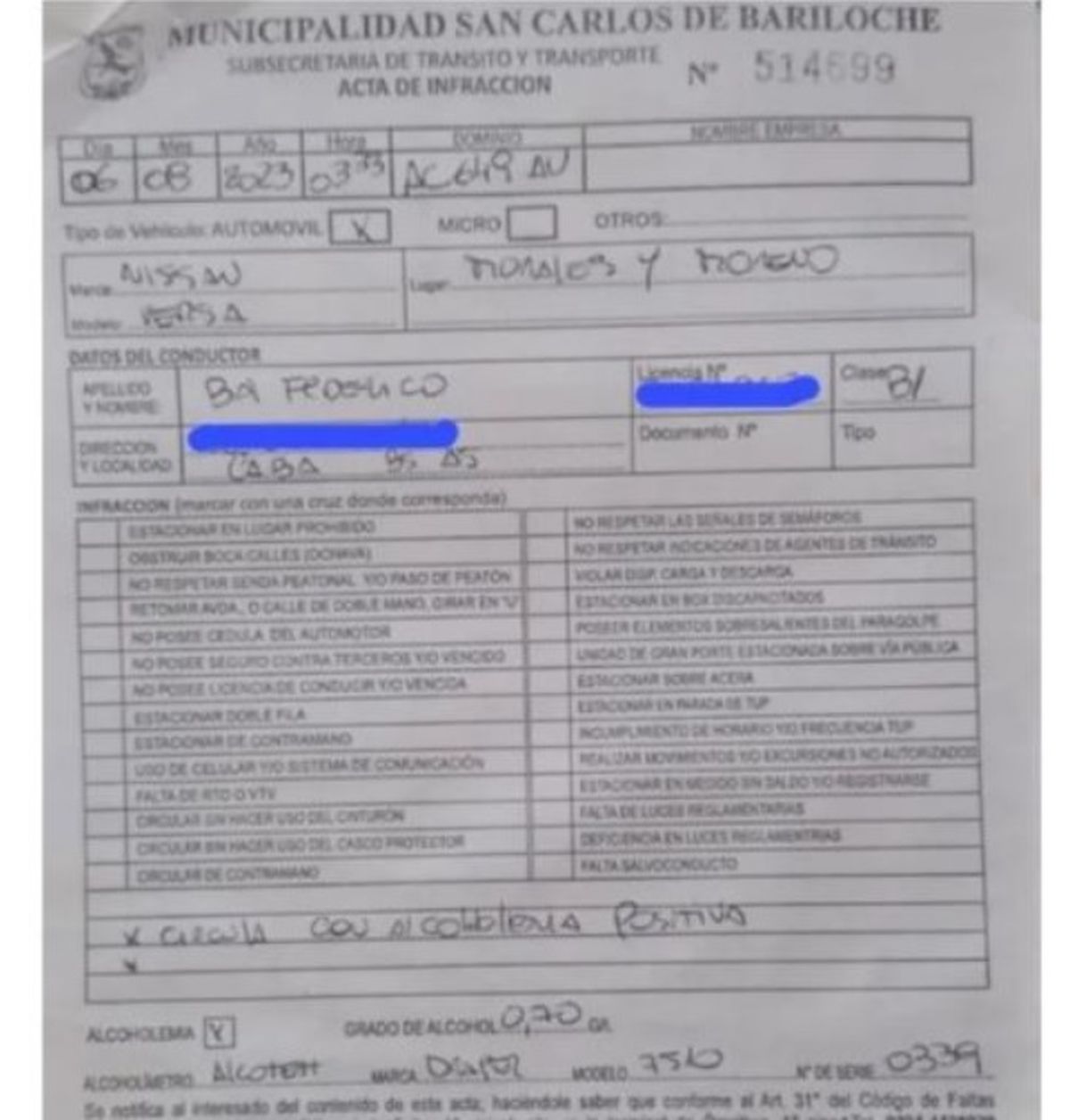 “Debe presentarse en el Juzgado de Faltas con copia de DNI y se le da la sentencia. Puede presentar un descargo para dar cumplimiento con lo establecido por la ordenanza. Tiene que proceder a hacer un curso de readecuación para el correcto uso de la vía pública y el de concientización sobre el consumo del alcohol", detalló el subsecretario de Tránsito y Transporte de Bariloche, Daniel Pincheira, a Cadena 3.