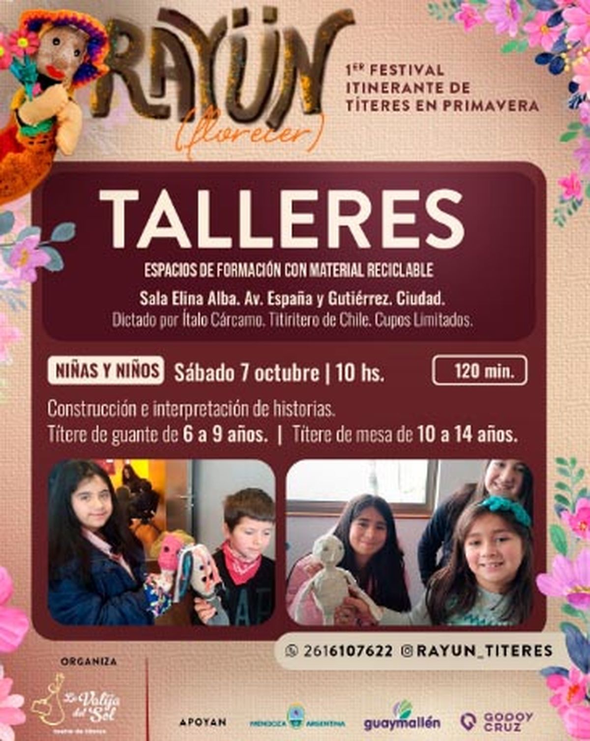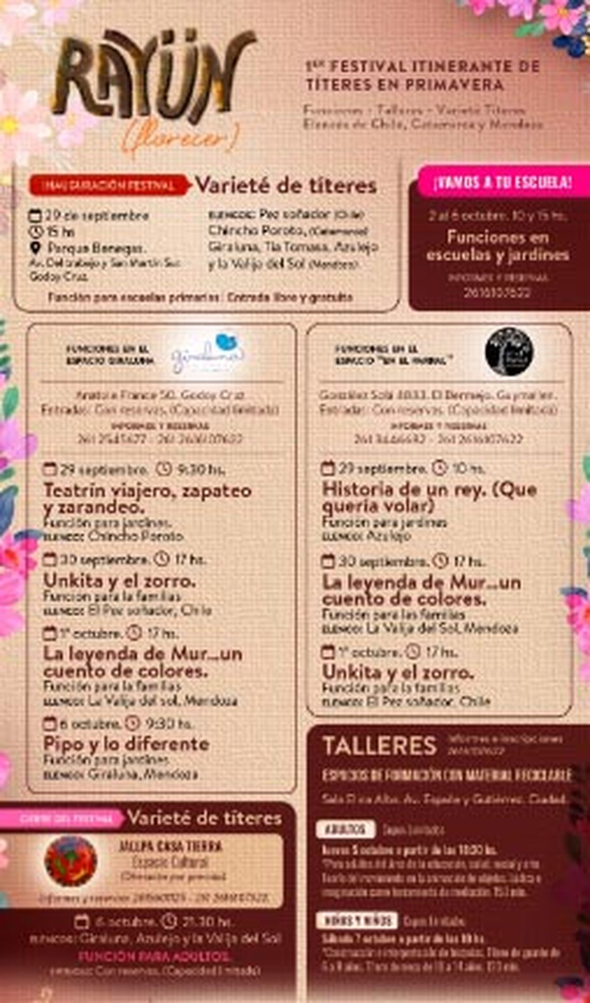 Desde el viernes 29 de septiembre y hasta el viernes 6 de octubre se realizará el Festival Itinerante de Títeres en Primavera RAYÜN” (Florecer) en distintos lugares de Mendoza.