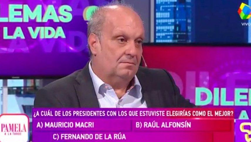 "¿Qué Dilema? Elegir uno de ellos tres. ¿Cuál de los presidentes con los que estuviste elegiría como el mejor? Mauricio Macri, Raúl Alfonsín o Fernando De La Rúa", preguntó la animadora.