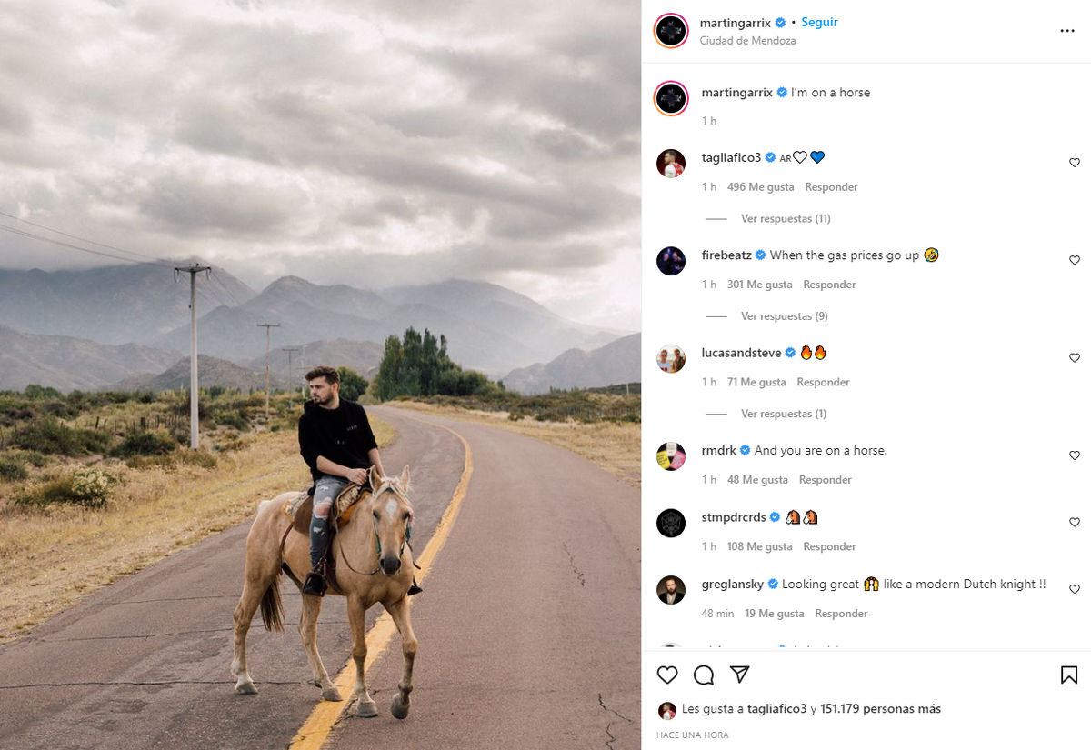 El joven de 25 años, nacido en Amstelveen -Países Bajos-, compartió en sus redes sociales una foto subido a un caballo y en su posteo de Instagram colocó su ubicación dando a conocer que está en Mendoza. "I’m on a horse", escribió el productor, que traducido al castellano significa "estoy en un caballo".
