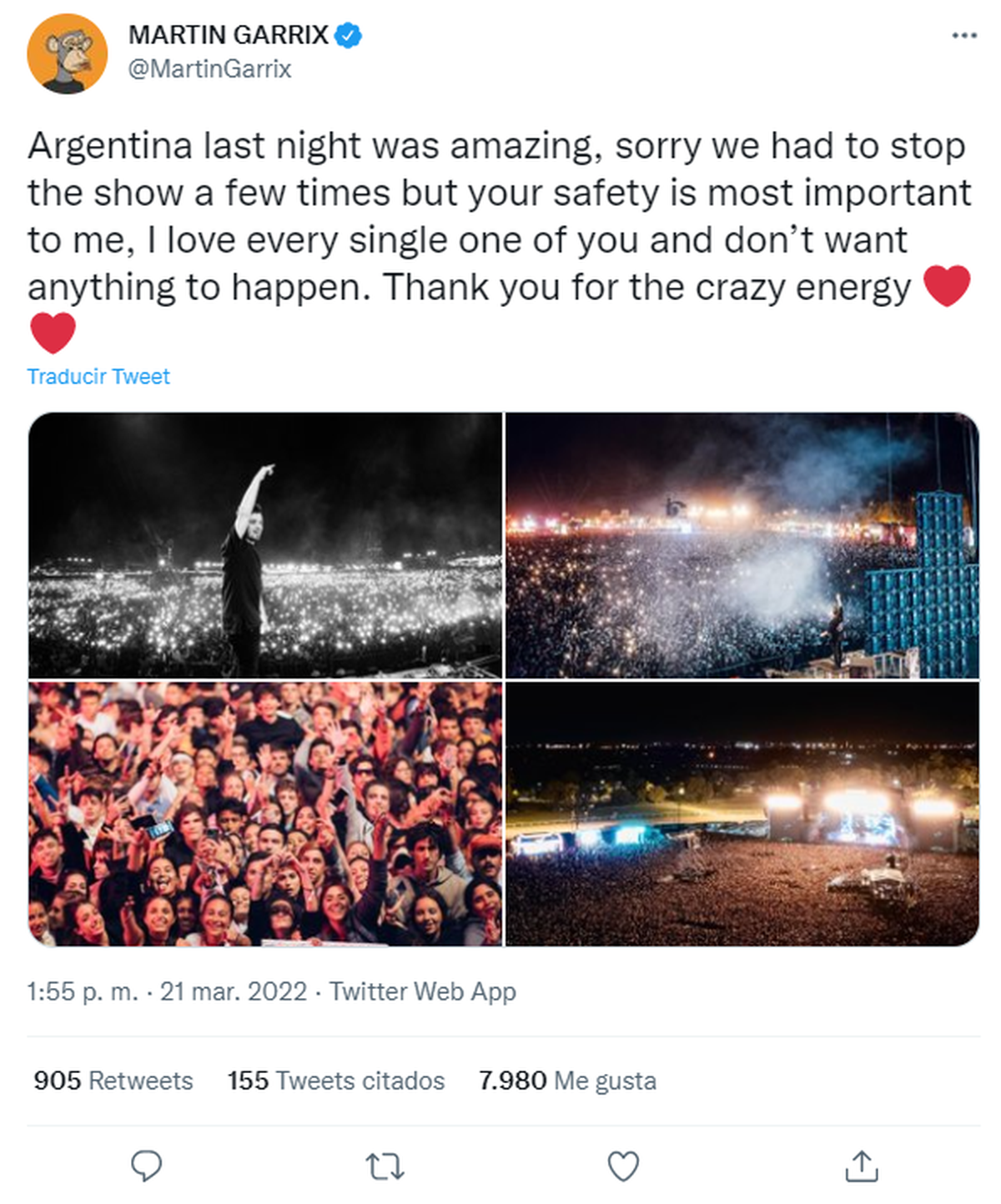 Garrix se refirió al respecto y en su cuenta de Twitter, además de agradecer por el cariño recibido, dijo: "Argentina anoche fue increíble, lo siento, tuvimos que detener el programa varias veces, pero su seguridad es lo más importante para mí, los amo a cada uno de ustedes y no quiero que pase nada. Gracias por la energía loca".