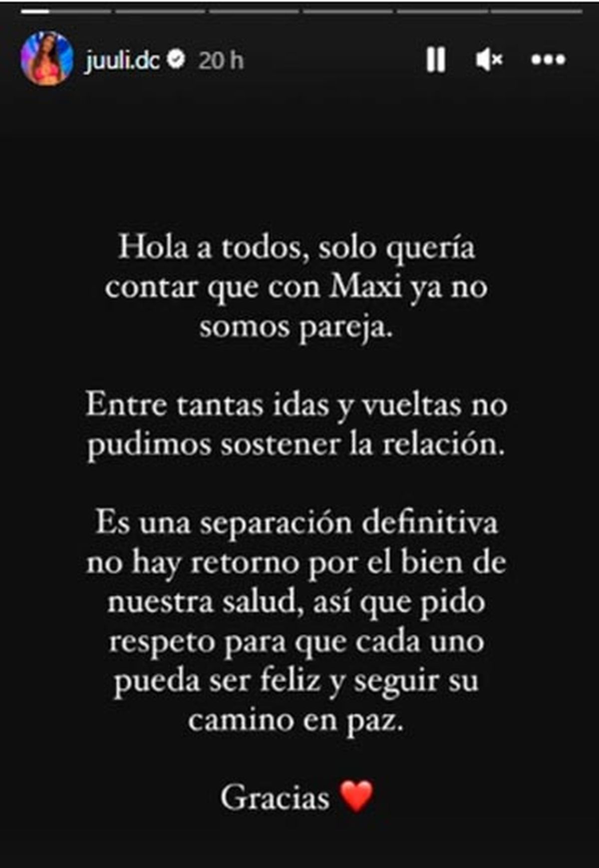 Horas antes, su pareja Juliana Díaz había anunciado la separación definitiva a través de un mensaje en sus redes sociales, a solo 19 días de haberse reconciliado con el cordobés. “Hola a todos, solo quería contar que con Maxi ya no somos pareja”, escribió en sus historias de Instagram. Haciendo referencia a los motivos de la ruptura, la participante del Bailando 2023 aclaró: “Entre tantas idas y vueltas no pudimos sostener la relación. Es una separación definitiva, no hay retorno por el bien de nuestra salud”.