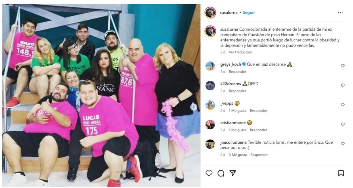 Su ex compañera le dedicó un posteo en su cuenta de Instagram para despedirlo, junto a una foto con otros participantes del programa: “Conmocionada al enterarme de la partida de mi ex compañero de Cuestión de peso, Hernán. El peso de las enfermedades, ya que partió luego de luchar contra la obesidad y la depresión y lamentablemente no pudo vencerlas”.