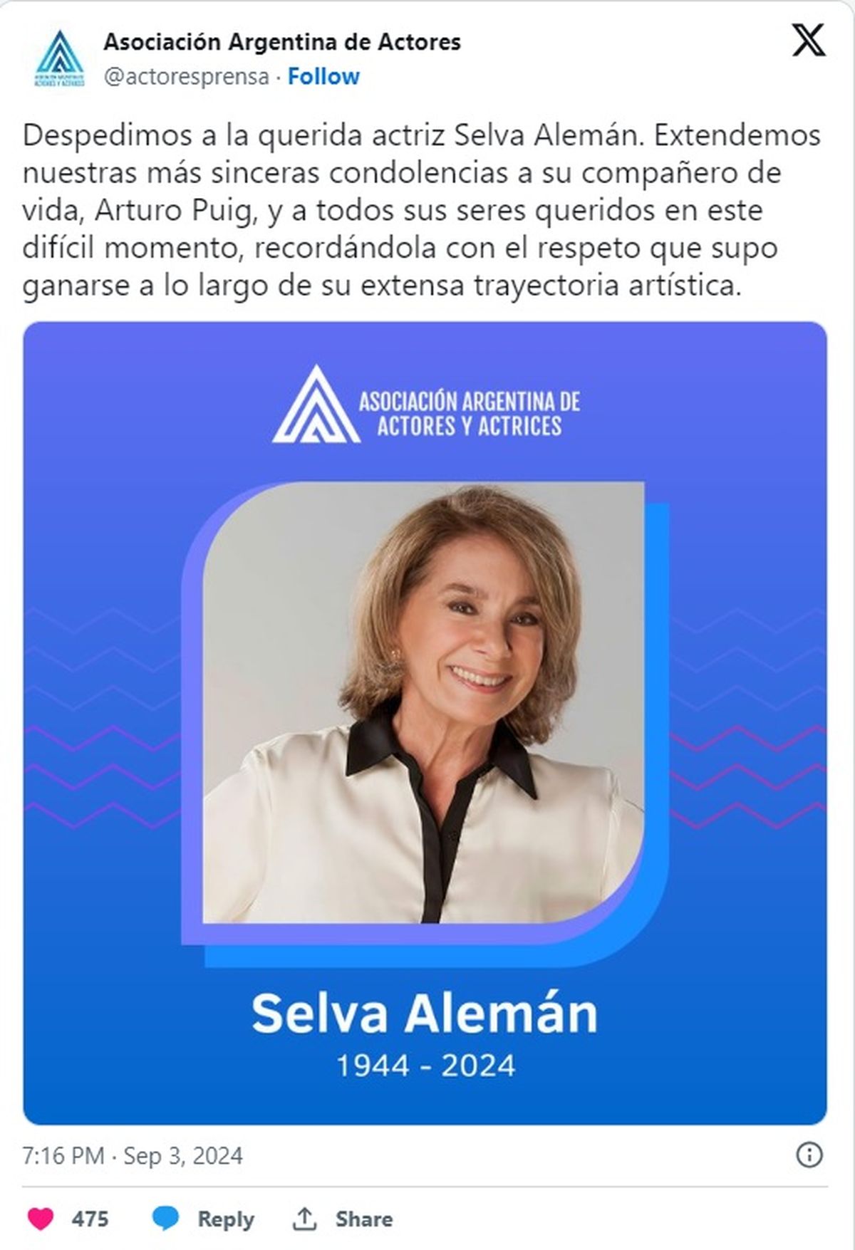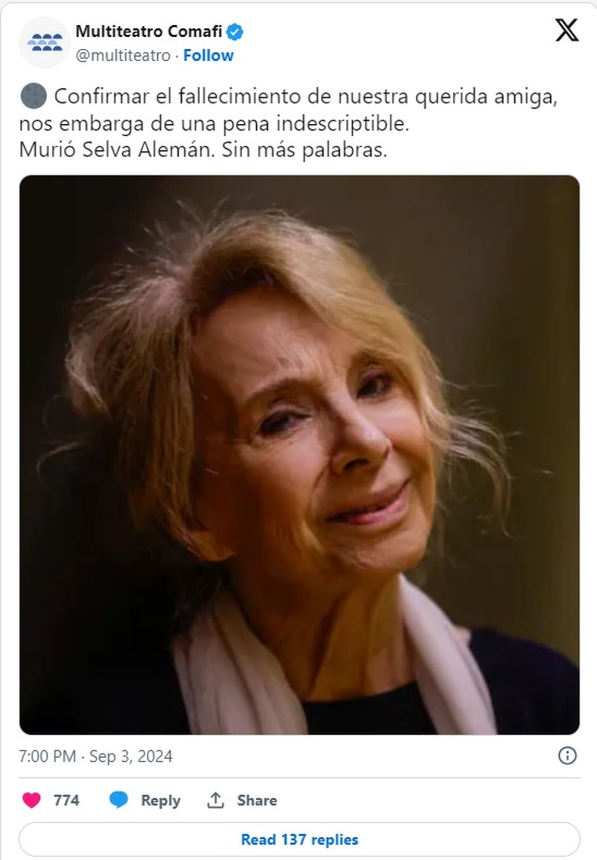 "Confirmar el fallecimiento de nuestra querida amiga, nos embarga de una pena indescriptible. Murió Selva Alemán. Sin más palabras", fue el posteo realizado por Multiteatro Comafi, confirmando la noticia.