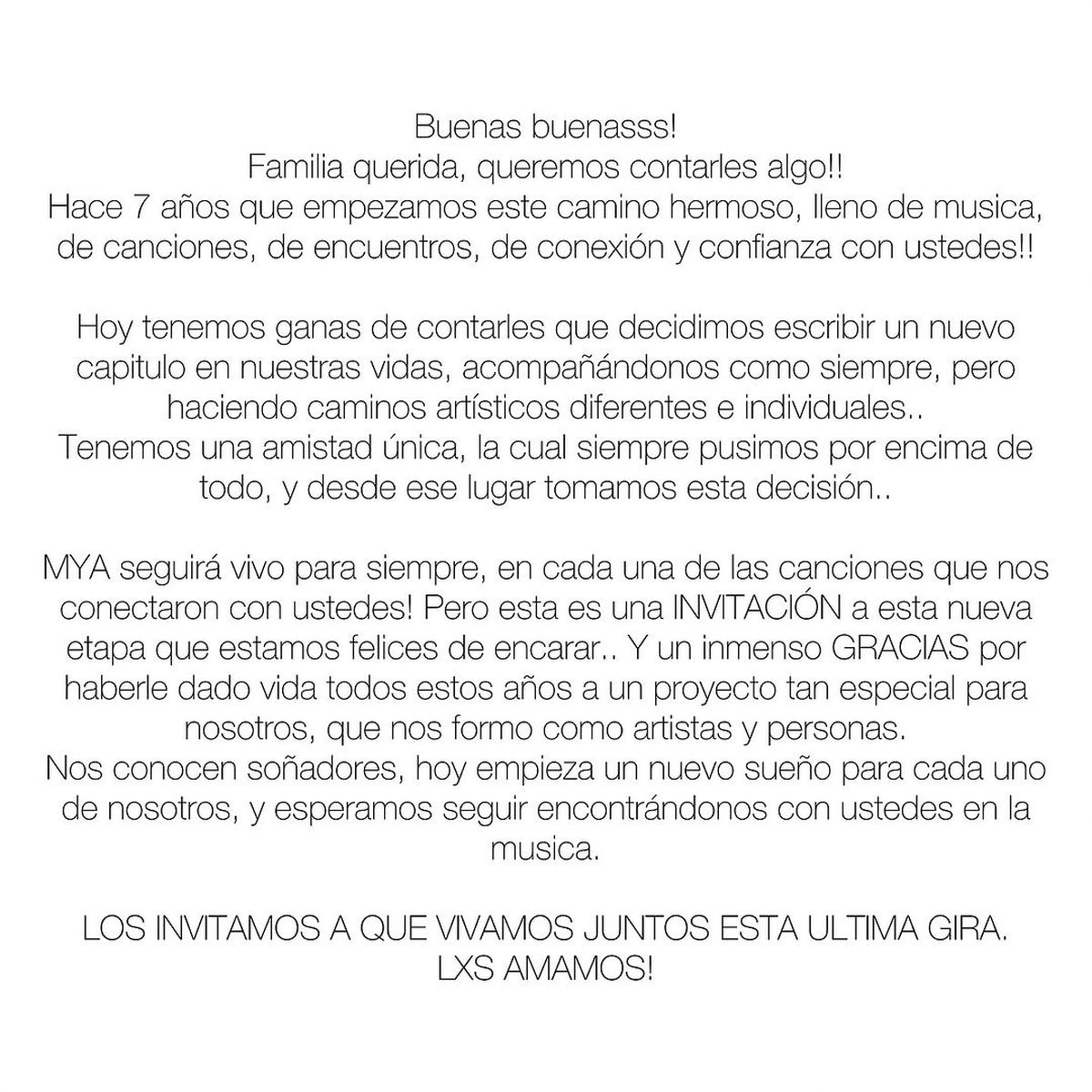 Más adelante, un posteo de Instagram dio a conocer la última decisión de MYA y sus clubes de fans no esperaron para organizar un sinfín de sorpresas para cada uno de los shows que tienen fecha en Santa Fé, Córdoba, Mendoza, Buenos Aires y más.