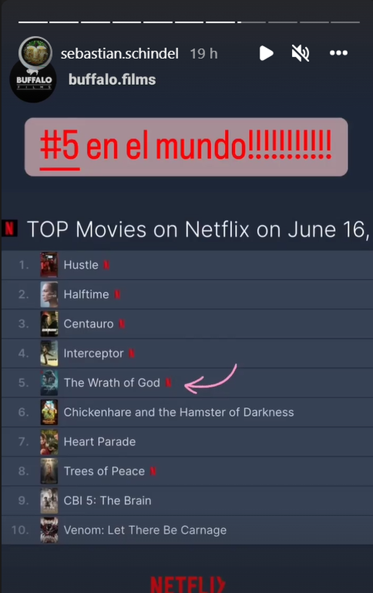 Por el momento lejos de alcanzar los números que dejó Granizo, quien se ubicó entre las primeras 3 más vistas del mundo a lo largo de algunos días, por el momento el éxito de La ira de Dios es sorprendente y también está dentro de las más vistas del planeta, según replicó su director.