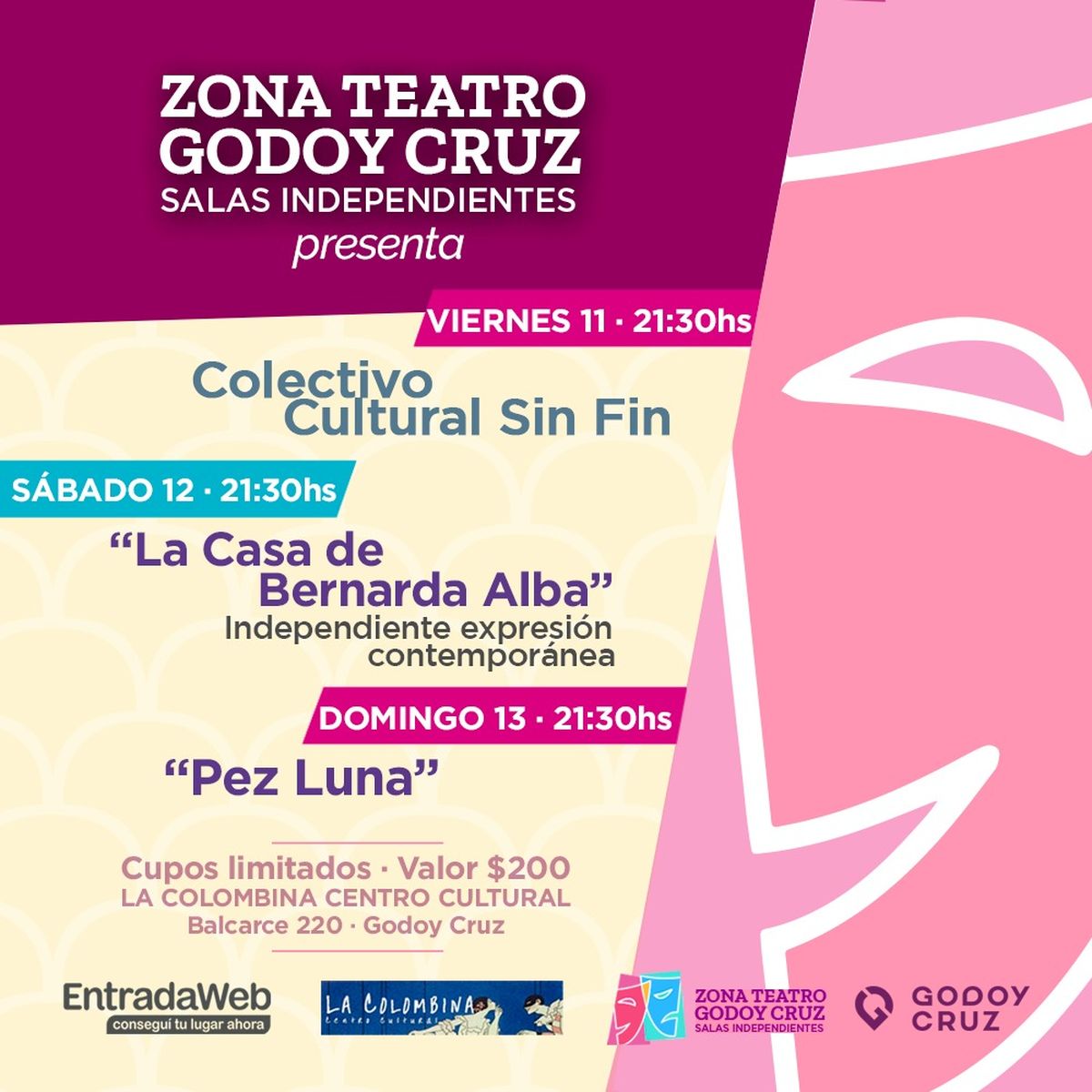 En La Colombina, Centro Cultural (Balcarce 220). El viernes 11 a las 21.30 Colectivo Cultural sin Fin, será el que abra con su performance el abanico de opciones que se ofrecerán en este ciclo. En tanto que el sábado 12 a la misma hora, los presentes podrán apreciar la obra “La Casa de Bernarda Alba”, cuya interpretación estará a cargo de una expresión Contemporánea independiente y llamará al público a la reflexión, de la mano de un fragmento de la reconocida obra del dramaturgo Federico García Lorca. Por su parte, el domingo 13 en la misma sala (también a las 21.30), será el turno de “Pez Luna”.