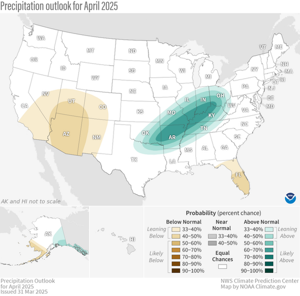 Con más de 5 pulgadas de lluvia pronosticadas desde el noreste de Texas, a través del Valle Central del Misisipi hasta el Valle del Ohio durante la primera semana de abril, no debería sorprender que el pronóstico de precipitaciones para abril favorezca condiciones más húmedas de lo normal en esta región.