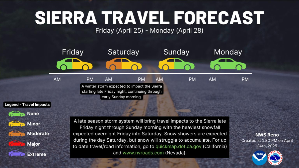 "La nieve puede producir poca visibilidad y condiciones de conducción difíciles en momentos puntuales", advierte el comunicado oficial del Servicio Meteorológico Nacional. En particular, secciones elevadas de la Carretera 395 y carreteras en el área de la cuenca del Lago Tahoe podrían verse gravemente afectadas.