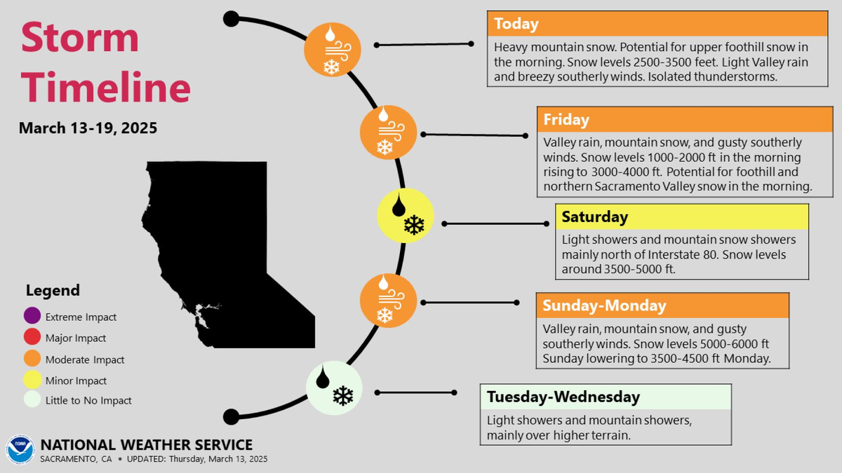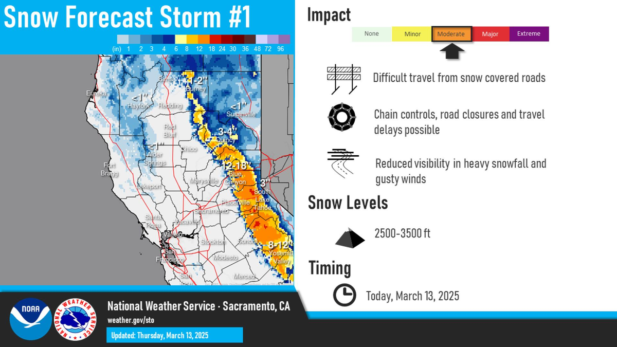 El Servicio Meteorológico Nacional de Estados Unidos emitió un alerta para Cuenca Burney, condado de Shasta, desde el suroeste del condado de Shasta hasta el oeste del condado de Colusa y Shasta Área del lago y Norte del condado de Shasta. Habrá acumulaciones de nieve de hasta 20 cm. La tormenta invernal será por encima de los 2000 pies, es posible que haya fuertes nevadas. Acumulaciones totales de nieve de 30 a 60 cm con vientos de ráfagas de hasta 80 km/h.