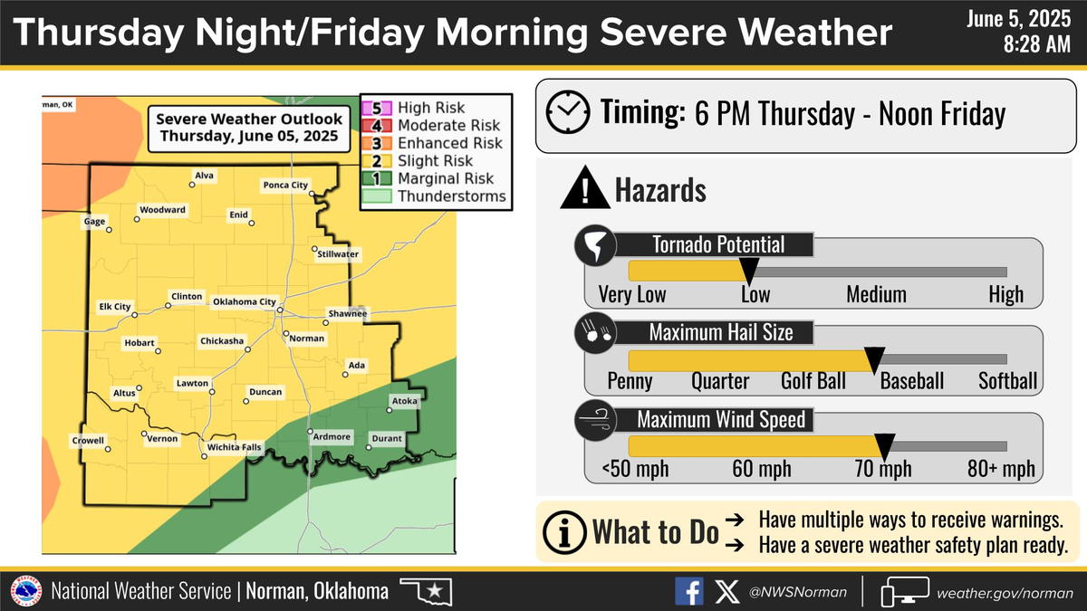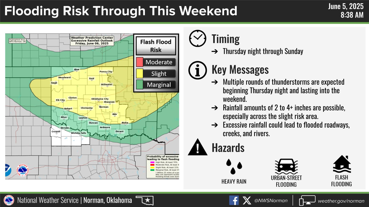 El Servicio Meteorológico Nacional de Estados Unidos emitió un alerta por la llegada de fuertes lluvias que podrían causar inundaciones en porciones del centro, norte, noroeste y oeste Oklahoma, incluidos los siguientes condados, en el centro de Oklahoma, Canadiense, Kingfisher, Lincoln, Logan, Oklahoma y Payne. En norte de Oklahoma, Garfield, Grant, Kay y Noble. En el noroeste Oklahoma, Alfalfa, Blaine, Dewey, Ellis, Harper, Major, Woods y Woodward. En el oeste de Oklahoma, Custer y Roger Mill.