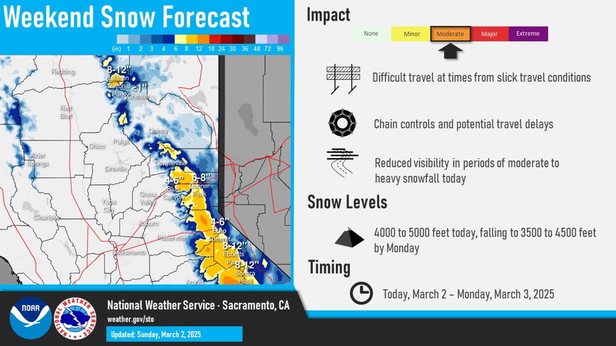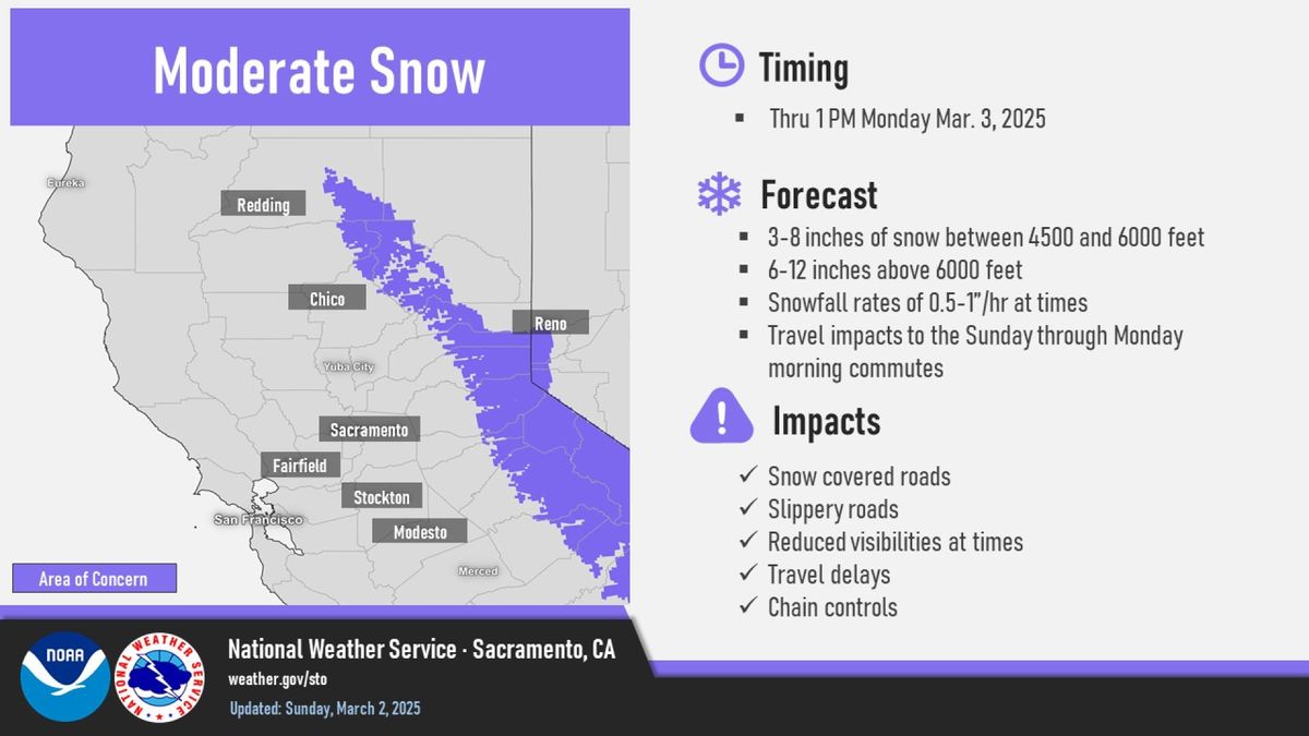 Las autoridades meteorológicas mantienen avisos de clima invernal hasta el lunes por la tarde para amplias zonas de la Sierra Nevada y sus alrededores. Según los reportes, se esperan acumulaciones de nieve entre 3 y 8 pulgadas (7.6 a 20.3 cm) en elevaciones entre 4500 y 6000 pies, y de 6 a 12 pulgadas (15.2 a 30.5 cm) por encima de los 6000 pies de altitud, con hasta 15 pulgadas (38.1 cm) en los picos más altos.