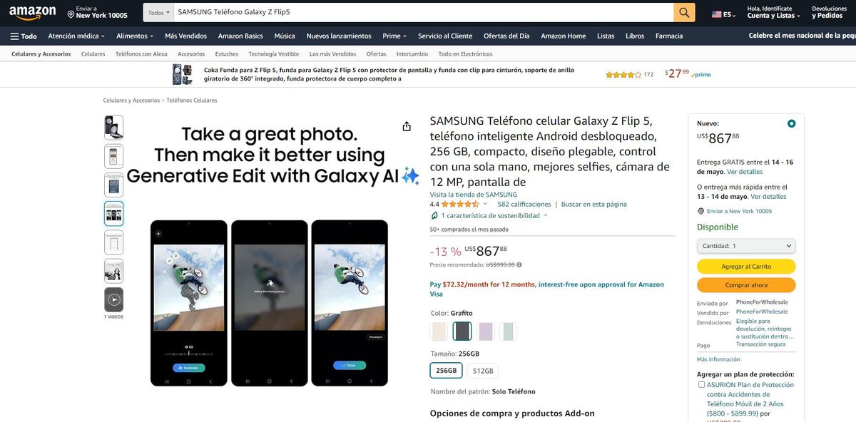Amazon actualmente ofrece una oferta increíble para el Samsung Galaxy Z Flip 5 en Estados Unidos. Este teléfono, conocido por su diseño plegable y su avanzada tecnología, está disponible con un descuento del 13% menos. Por lo general, el modelo de 256 GB tiene un precio de 999,99 dólares, pero con la oferta, se reduce a 867,88 dólares. Además, Amazon ofrece envío gratuito para este artículo.