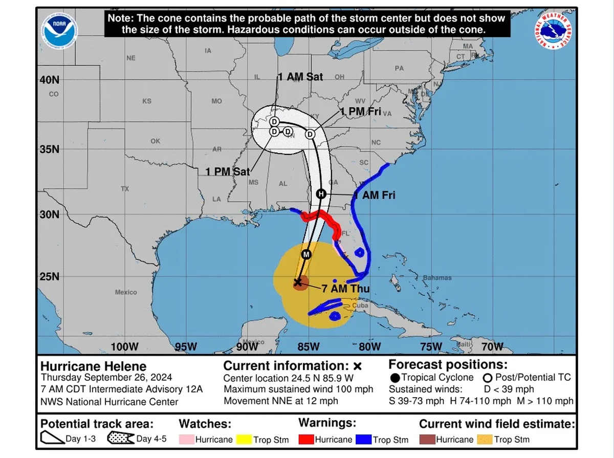 Las predicciones son muy certeras: tras tocar tierra en Florida, Helene seguirá su camino al norte, a través de Georgia, y afectará con fuerza a las Carolinas. De hecho, un mensaje del NOAA (Administración Nacional Oceánica y Atmosférica, por sus siglas en inglés), advirtió de "una marejada ciclónica catastrófica y mortal" en la zona del Big Bend, pero no dio mejores pronósticos para el resto de los estados.