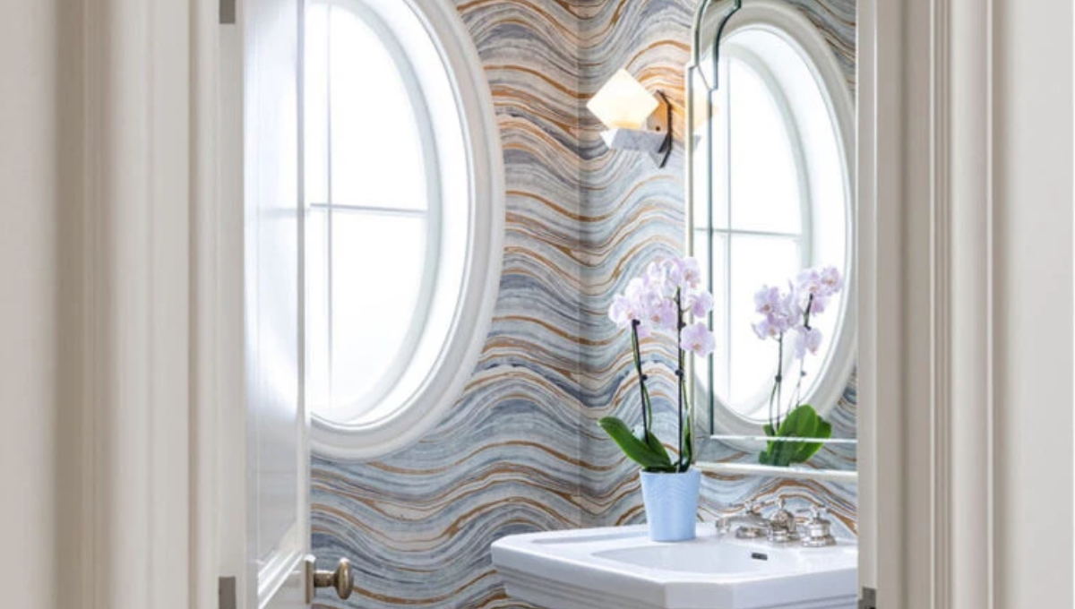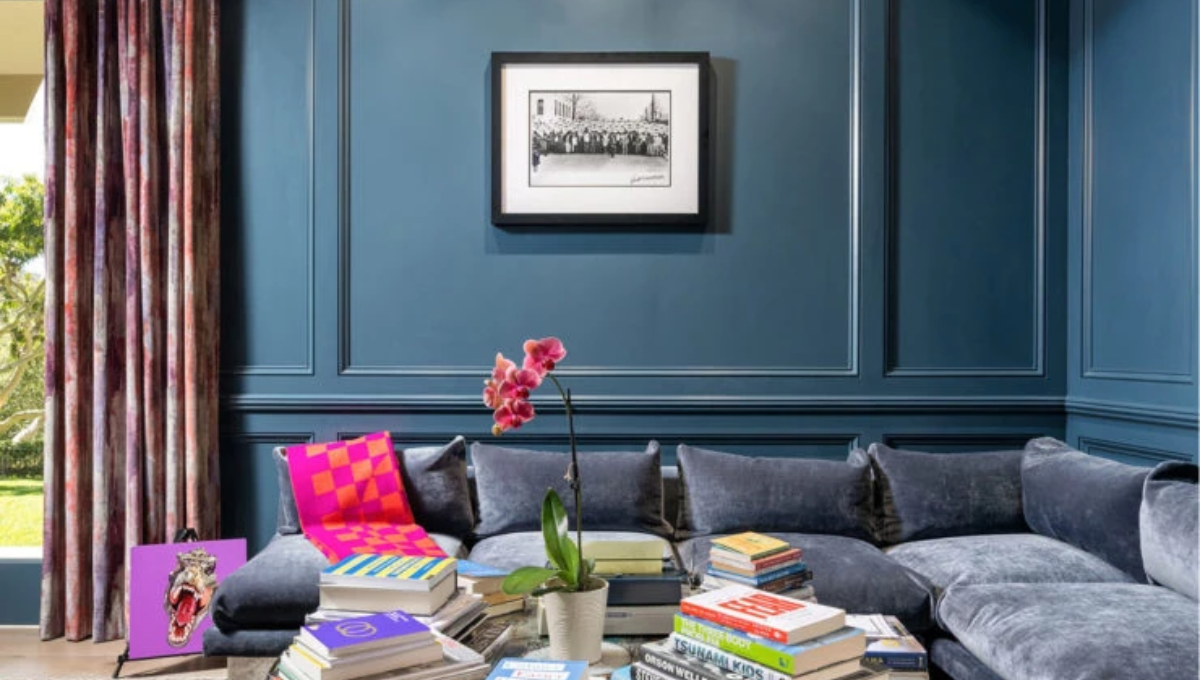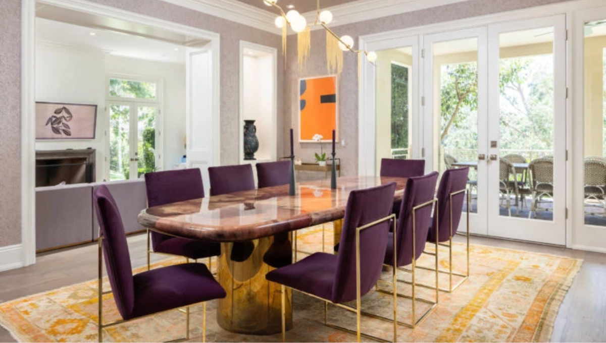Por otro lado, en el interior sorprenden y encantan los detalles que se encuentran en la casa. En gran parte, las paredes son de color azul marino, aunque tiene detalles de pinceladas de colores llamativos como el morado de los muebles del comedor y el empapelado de los baños.