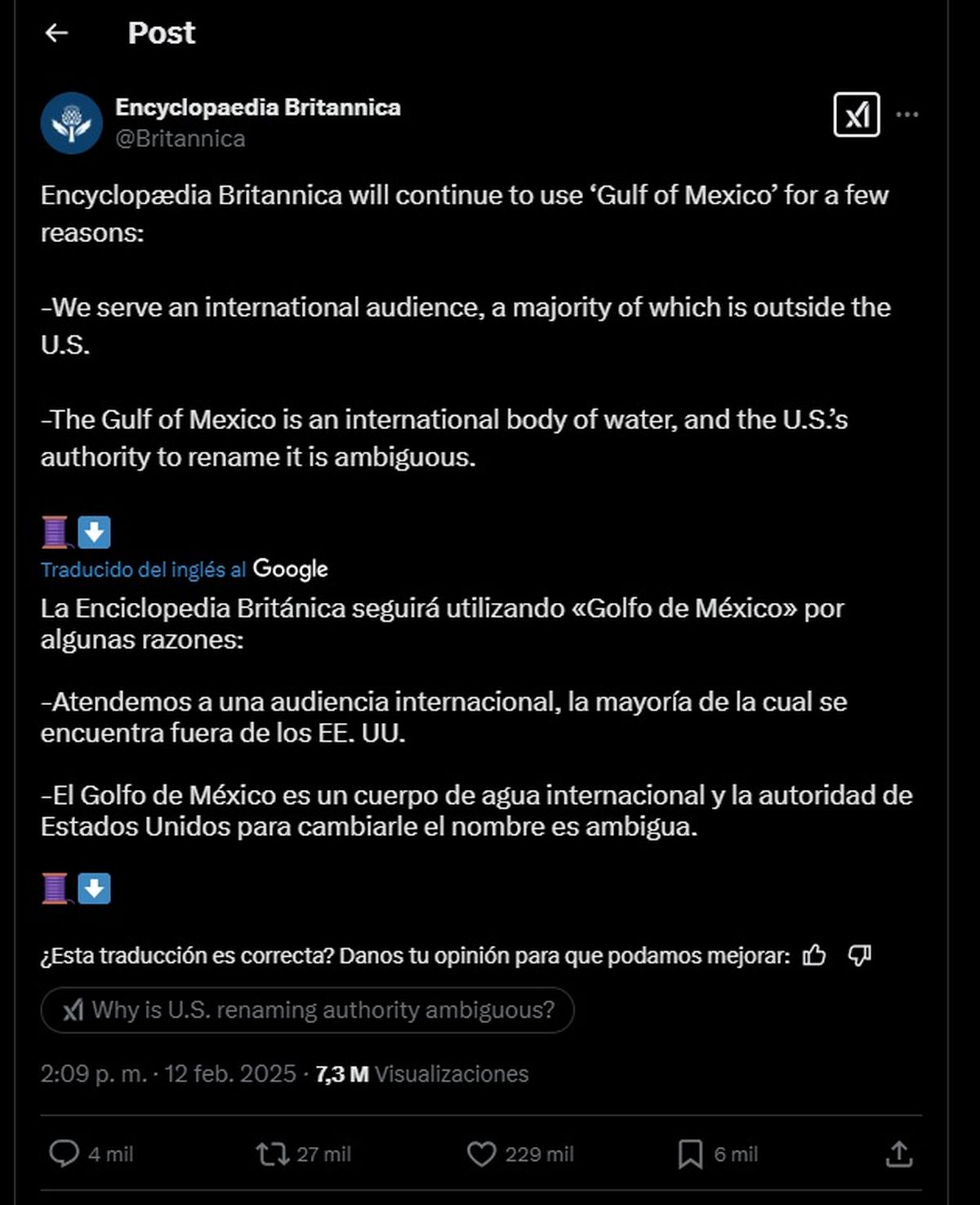 "La Enciclopedia Británica seguirá utilizando «Golfo de México» por algunas razones. Atendemos a una audiencia internacional, la mayoría de la cual se encuentra fuera de los EE. UU. El Golfo de México es un cuerpo de agua internacional y la autoridad de Estados Unidos para cambiarle el nombre es ambigua", se lee en la publicación que hicieron el 12 de febrero.